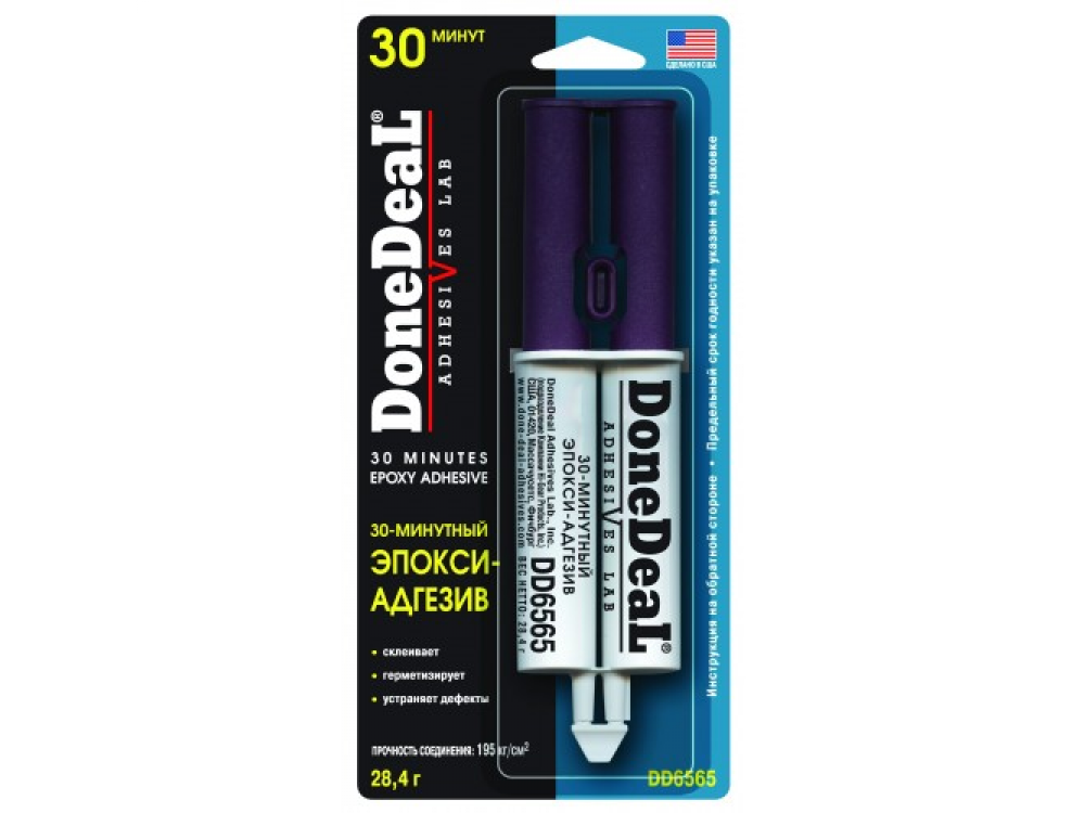 30-минутный эпокси-адгезив (шприц, прозрачный) 28,4 г. Обеспечивает профессиональное, надежное и долговременное соединение, выдерживающее ударные нагрузки, вибрацию, перепады температур и воздействие агресивных жидкостей. Предназначен для склеивания керамики, фарфора, стекла, дерева, картона, кожи и ряда металлов. Схватывается за 30 минут, отвердевает за 8 часов, полностью полимеризуется за 24 часа. Диапазон рабочих температур: от -55 до +125. DD6561 после полимеризации безвреден, устойчив к воздействию нефтепродуктов, воды, растворителей; обладает хорошими эксплуатационными характеристиками, не дает усадки; выдерживает постоянные и переменные нагрузки, вибрации; упаковка "сдвоенный шприц" позволяет добиться точной дозировки компонентов и стабильной прочности клеевого шва.