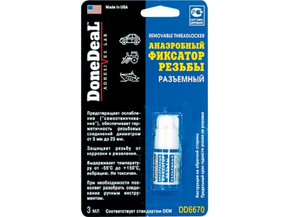 DD6670 рекомендуется применять во всех случаях, когда резьбовое соединение не должно ослабляться под действием напряжений, ударных нагрузок, вибраций, но может быть демонтировано при помощи ручного инструмента. Анаэробный фиксатор для герметичности резьбовых соединений от 5мм до 25мм. Характеристики: Состав - метакриловые эфиры. Цвет - прозрачный. Термоустойчивость - от -55 °С до +150 °С. Вязкость, сПз - 600. Заполнение зазора - 0,18мм. Прочность на срез - 140 кг/см2. Диаметр восст.резьбы - 5…25мм. Разборка соединения - ручным инструментом. Время схватывания - 15 мин. Время отвердевания - 60 мин. Полная полимеризация - 24 ч. Область применения: DD6670 используются для фиксации резьбовых, штифтовых и болтовых соединений: штифтов коромысел, регулировочных болтов, болтов клапанных крышек, масляного поддона, неподвижных тормозных скоб, деталей впускной системы, генератора, посадочных мест шкивов и пр. Особенности и преимущества: заполняя зазор, DD6670 способствует более равномерному распределению нагрузки; фиксирует и герметизирует соединение; предохраняет восстановленные соединения от влаги и коррозии; предотвращает ослабление и самоотвинчивание соединений.