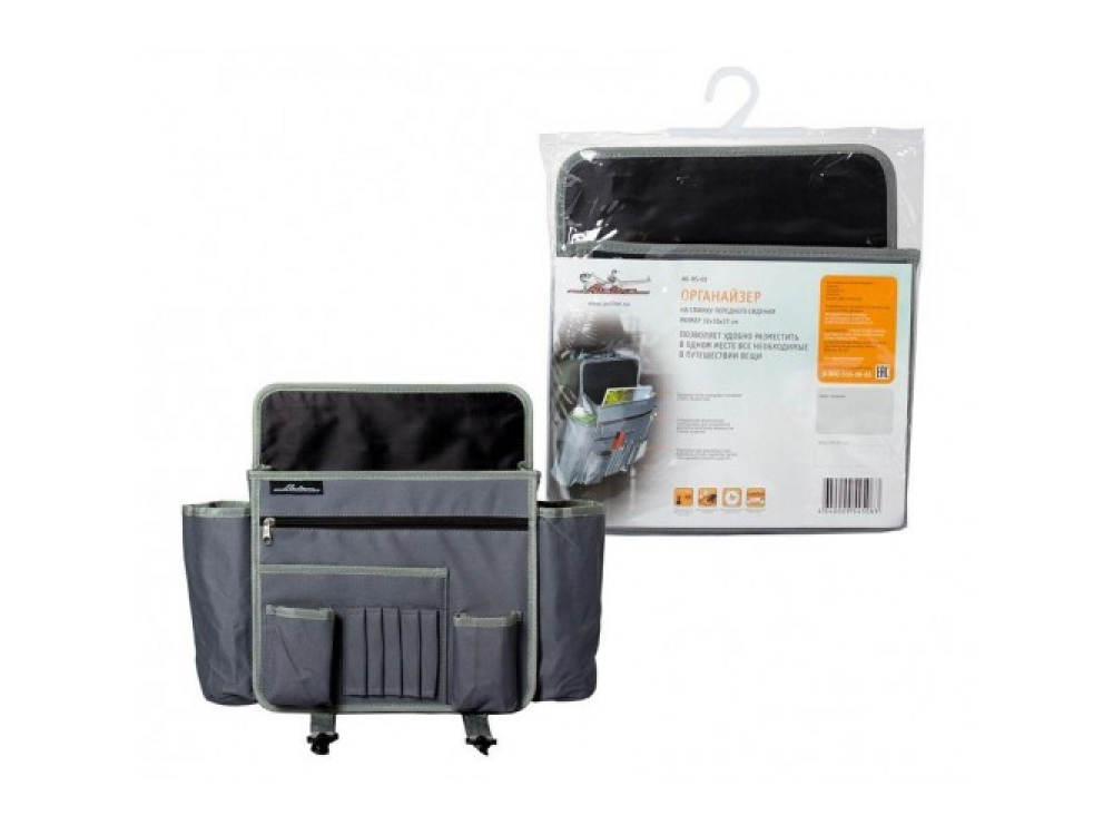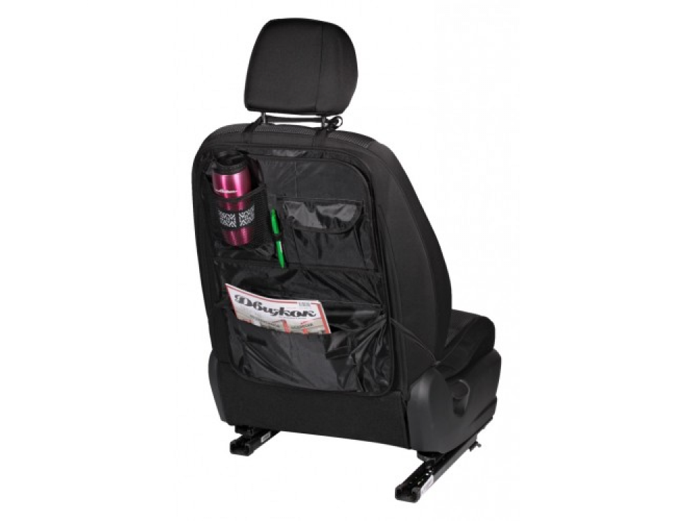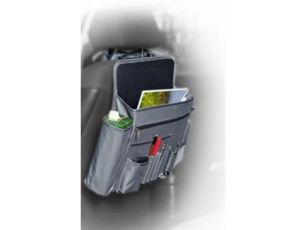Многофункциональный компактный органайзер на спинку переднего сиденья оснащен удобной системой для хранения предметов различного назначения. На органайзере присутствует «откидной регулируемый столик», отдел для бумаг, карманы для ручек и канцелярских принадлежностей, отделы для гаджетов, а также карманы-подстаканники. Органайзер изготовлен из прочного и легко моющегося материала - 100% полиэстера.