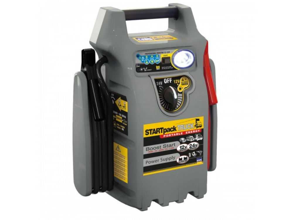GYSPACK TRUCK - пусковое устройство мгновенно запускает мотоциклы, автомобили, кемпинг-кары без риска для бортовой электроники. Встроенная лампочка для освещения во время запуска. Питает все электроприборы 12В на постоянном токе благодаря 2 встроенным АКБ емкостью 22Aч. Особенности: - Автоматическое ЗУ 230В /12В Floating : для заряда встроенной АКБ без надзора - Заряжает АКБ на 100%, сберегает срок службы и технические характеристики. - Может оставаться постоянно подключенным к сети; ставить заряжаться после каждого использования. - Прерыватель батарей ON/OFF , защита в случае неправильного обращения. - Звуковой сигнал предупреждает об инверсии полярности. - Медные кабели 2 x 1.80м, ? 25мм? с изолированными зажимами 600 A. - Оснащен плавким предохранителем 300A на задней панеле. Технические характеристики: Наименование Значение Напряжение запуска 12 В / 24 В Емкость аккумулятора 2х22 Ач Пусковой ток 12 В 750 А Пусковой ток 24 В 650 А Пиковый пусковой ток 12 В 3200 А Пиковый пусковой ток 24 В 1600 А Габариты 389х225х500 мм Вес 16 кг