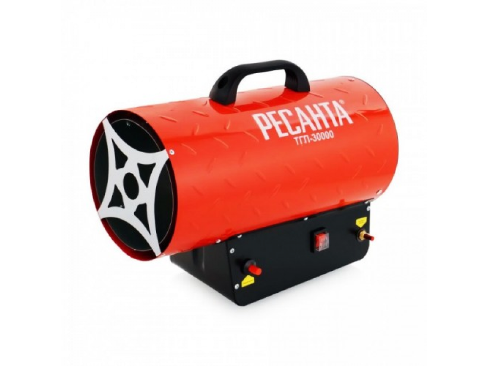 Газовая тепловая пушка РЕСАНТА ТГП-30000 – воздухонагреватель, работающий на сжиженном газовом топливе. Топливо необходимо для получения горячей атмосферы в камере сгорания, а электроэнергия, подводимая к устройству, необходима для питания вентилятора, нагнетающего воздух, и для функционирования автоматики. Газовые пушки прямого нагрева являются простой и надёжной конструкцией без дымохода, где горячий воздух из устройства поступают в помещение.